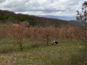 We then moved to the field, joined by Bartolini’s dog, Luna, and his father. The farm itself was different from any other type of agriculture that I have seen. Bartolini’s land consists of many different plots of oak trees, with truffles growing on the roots. When deciding to start a farm, soil tests must be conducted to test if the land is suitable for truffle production. If it is, oak trees are planted and truffle growth is encouraged by pouring water with spores onto the roots of the trees. After some time, truffles will grow.